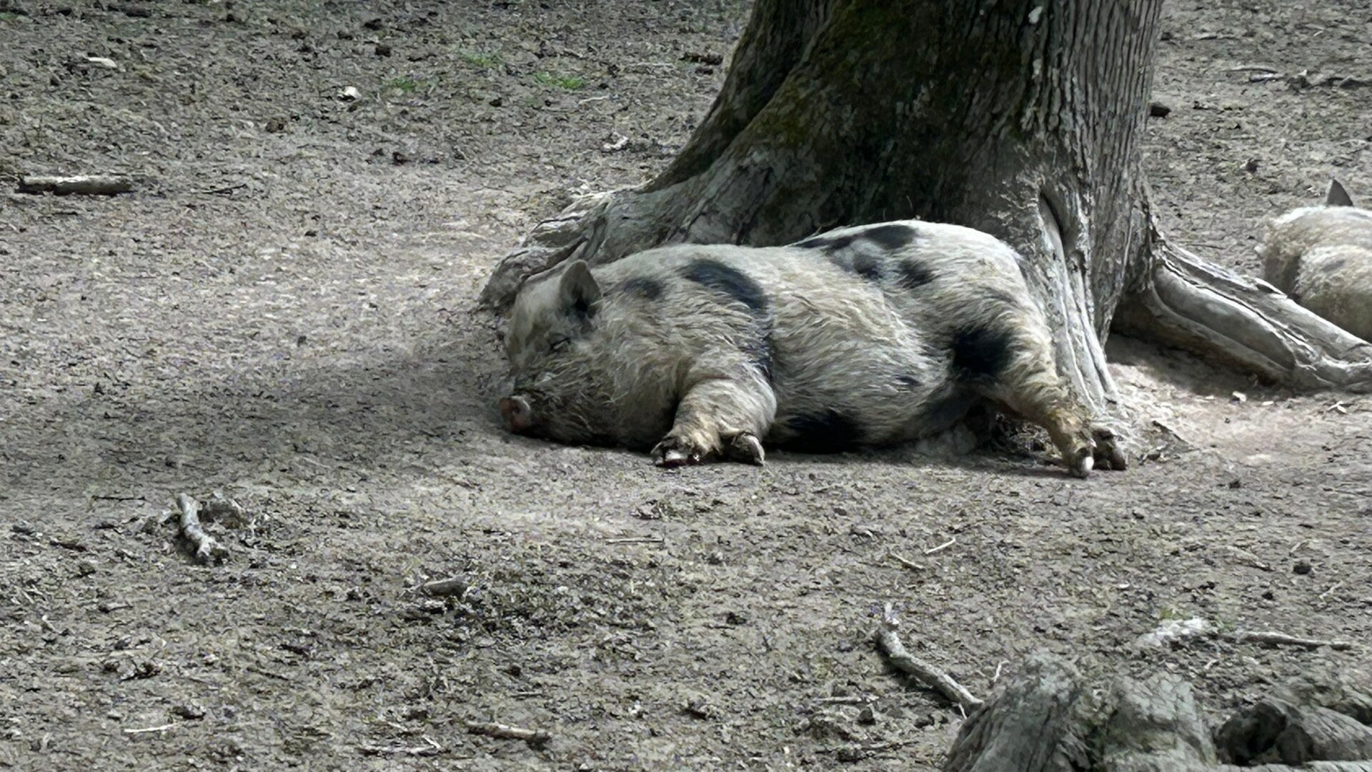 Dans la réalité : disons que Netflix n’a pas encore acheté les droits.Déjà, il faut oser pousser le portail (moment de doute existentiel) puis emprunter un long chemin digne d’une quête initiatique pour atteindre les premiers enclos. Et là, double grillage… pratique pour la sécurité, moins pour les photos. Côté faune, j’ai quand même croisé des biches, des daims, des sangliers de toutes tailles (la famille au complet), des poules, des oiseaux, des lapins, des chèvres et même des cochons. Une vraie coloc géante.